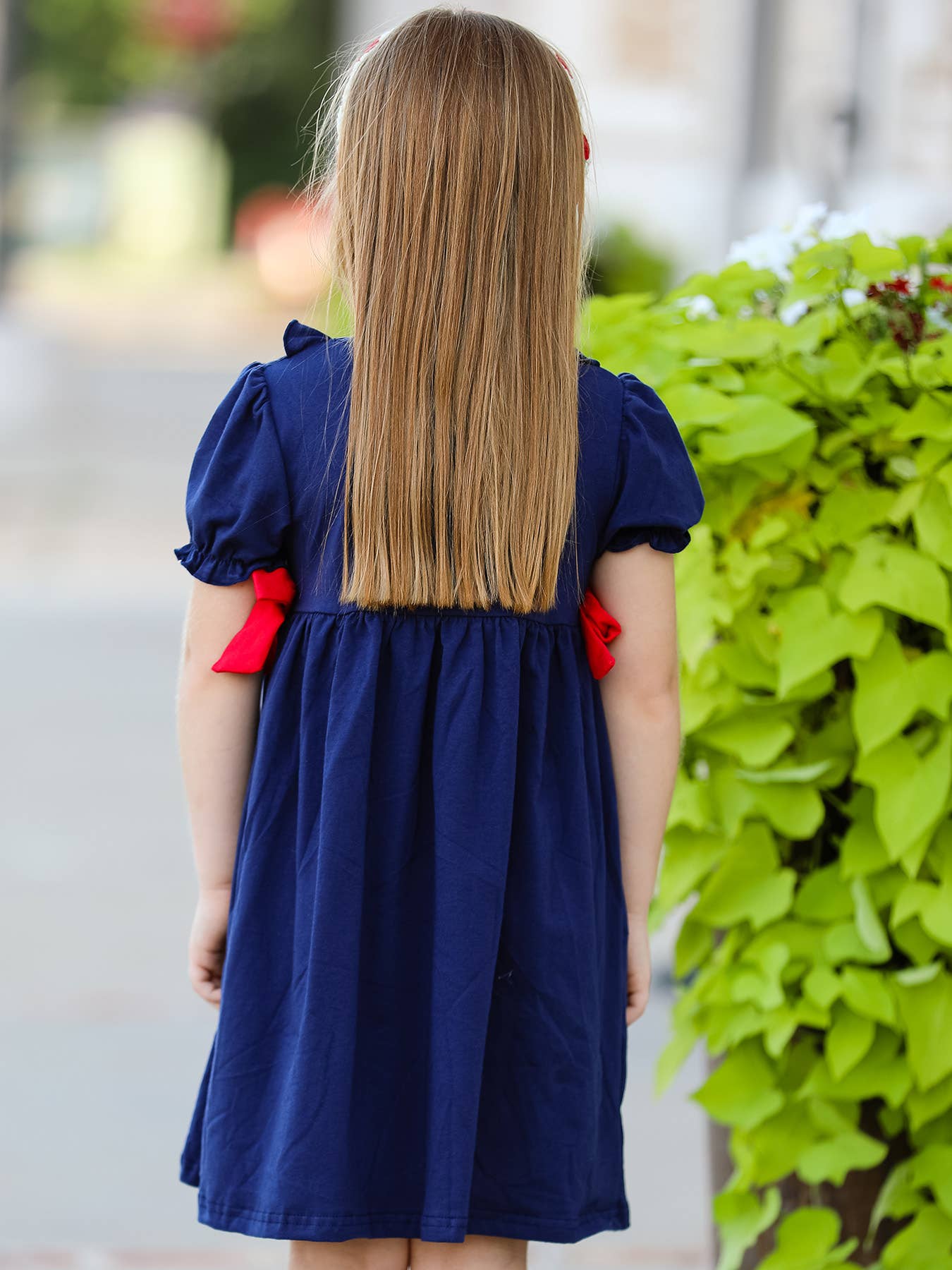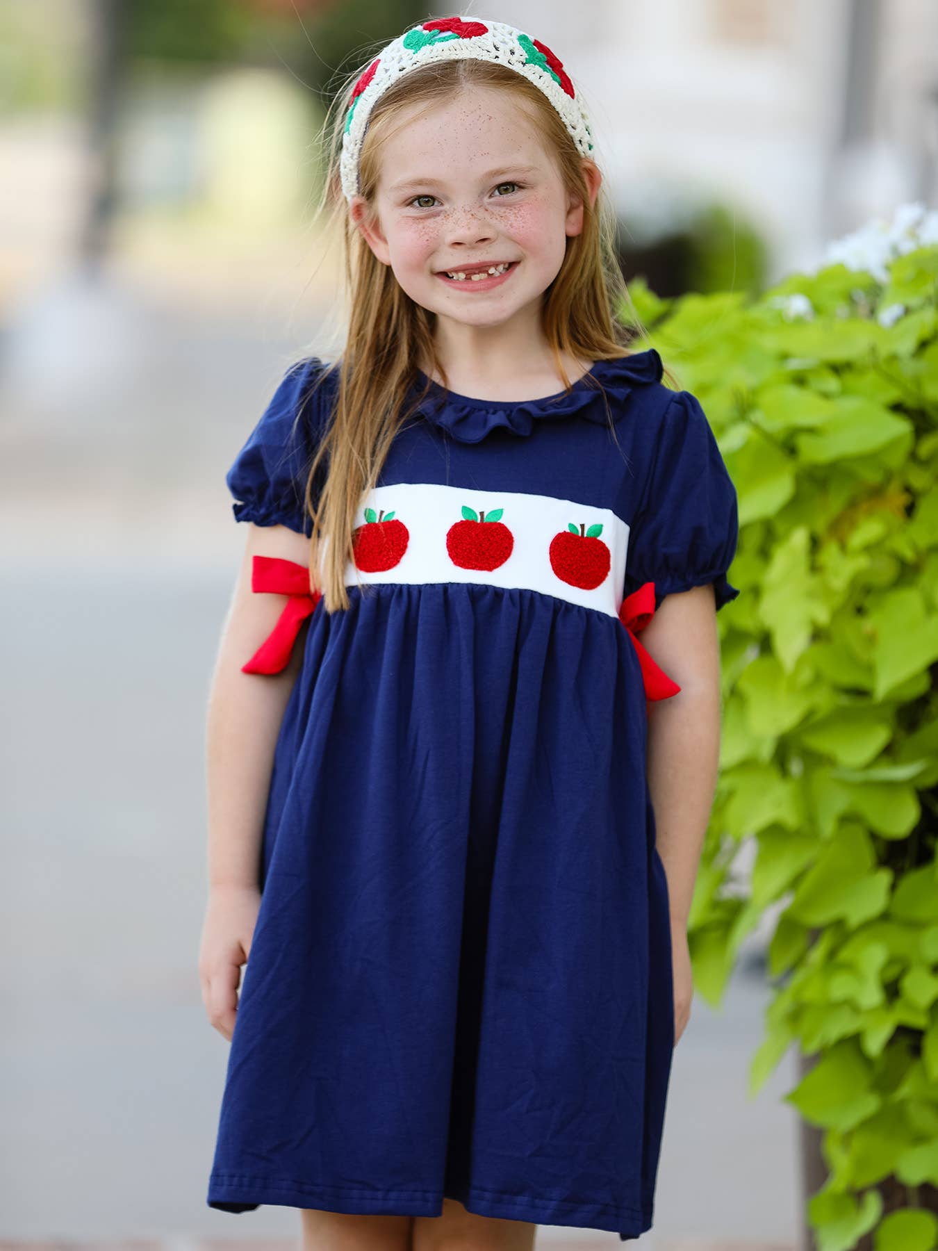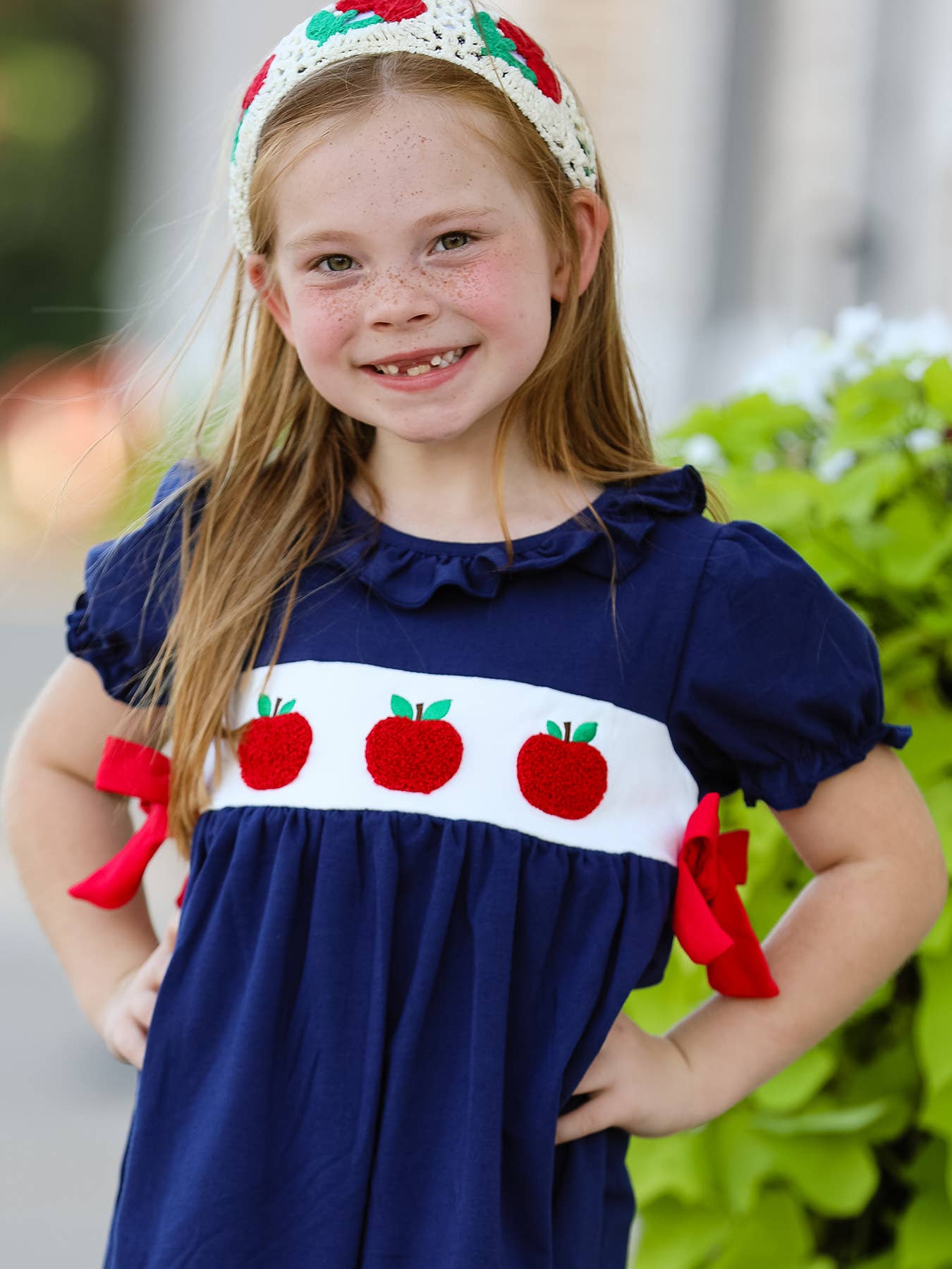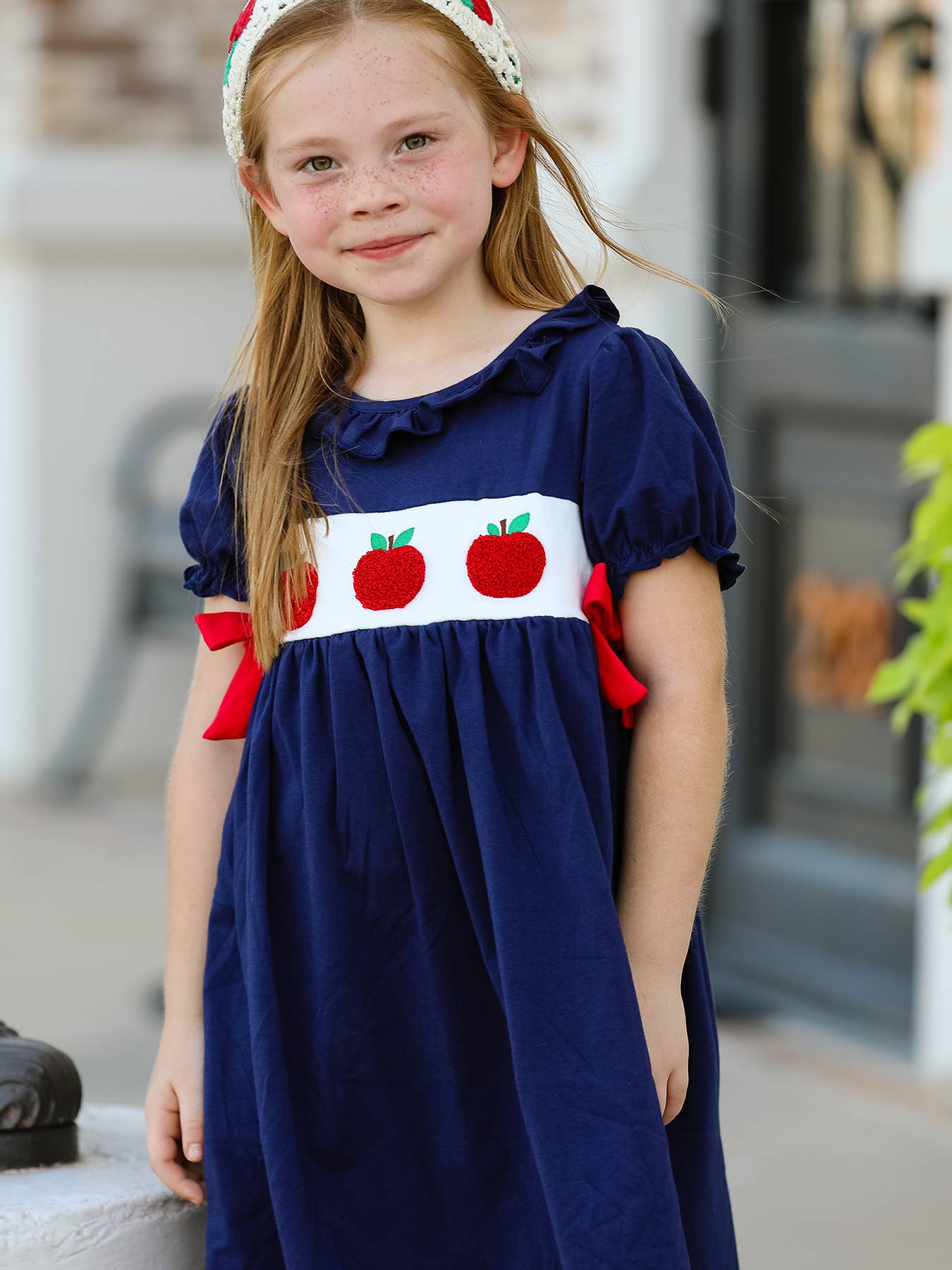 Embrace the back-to-school season with this charming navy dress adorned with a delicate bow apple applique. Perfect for your little girl's first day, it offers a classic look with a touch of whimsy. Get her ready to shine with this must-have dress!
