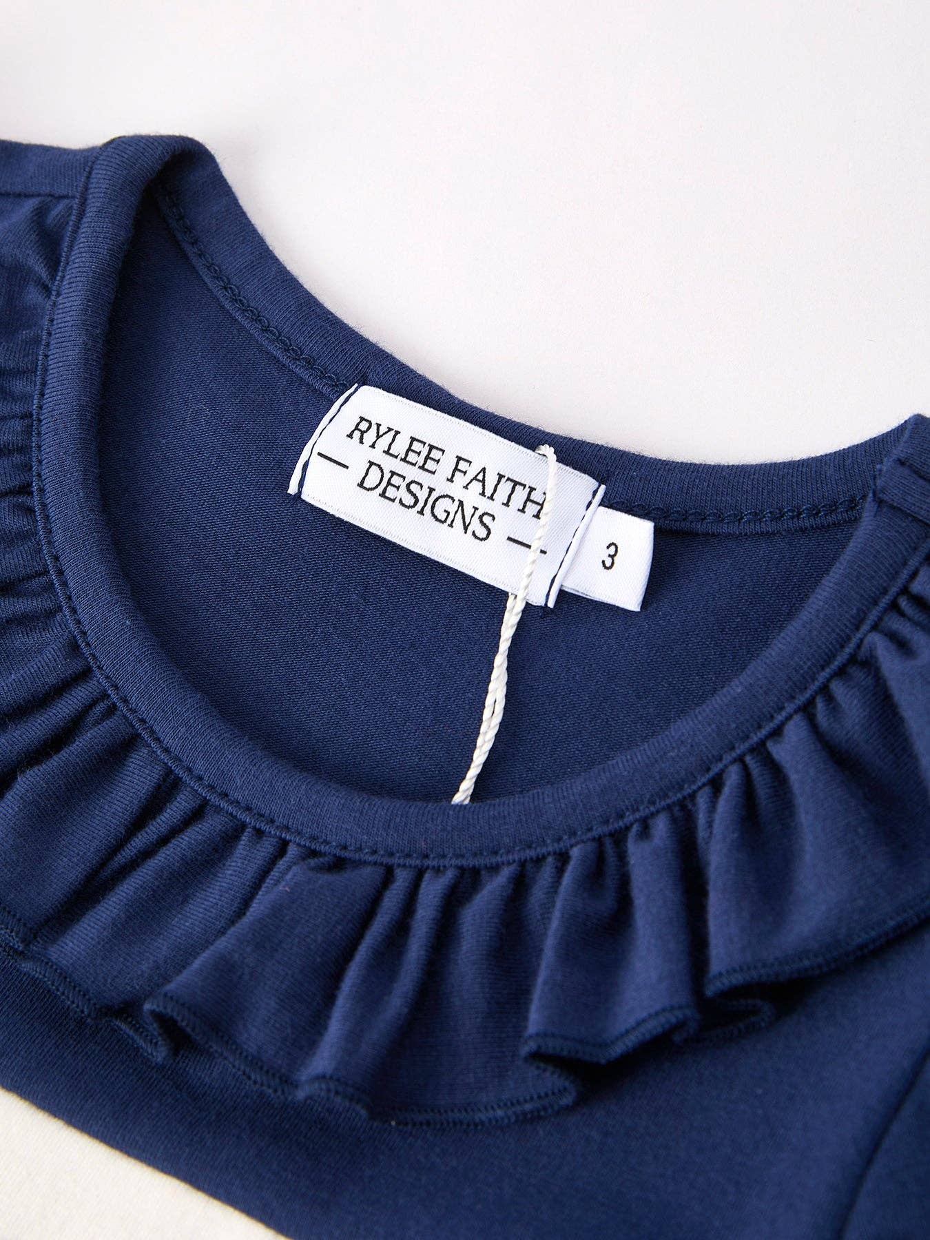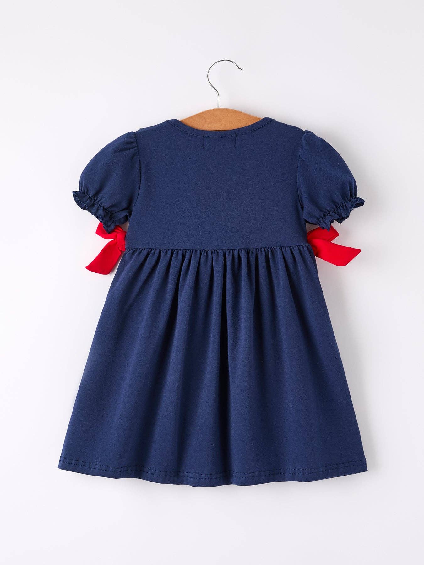 Embrace the back-to-school season with this charming navy dress adorned with a delicate bow apple applique. Perfect for your little girl's first day, it offers a classic look with a touch of whimsy. Get her ready to shine with this must-have dress!