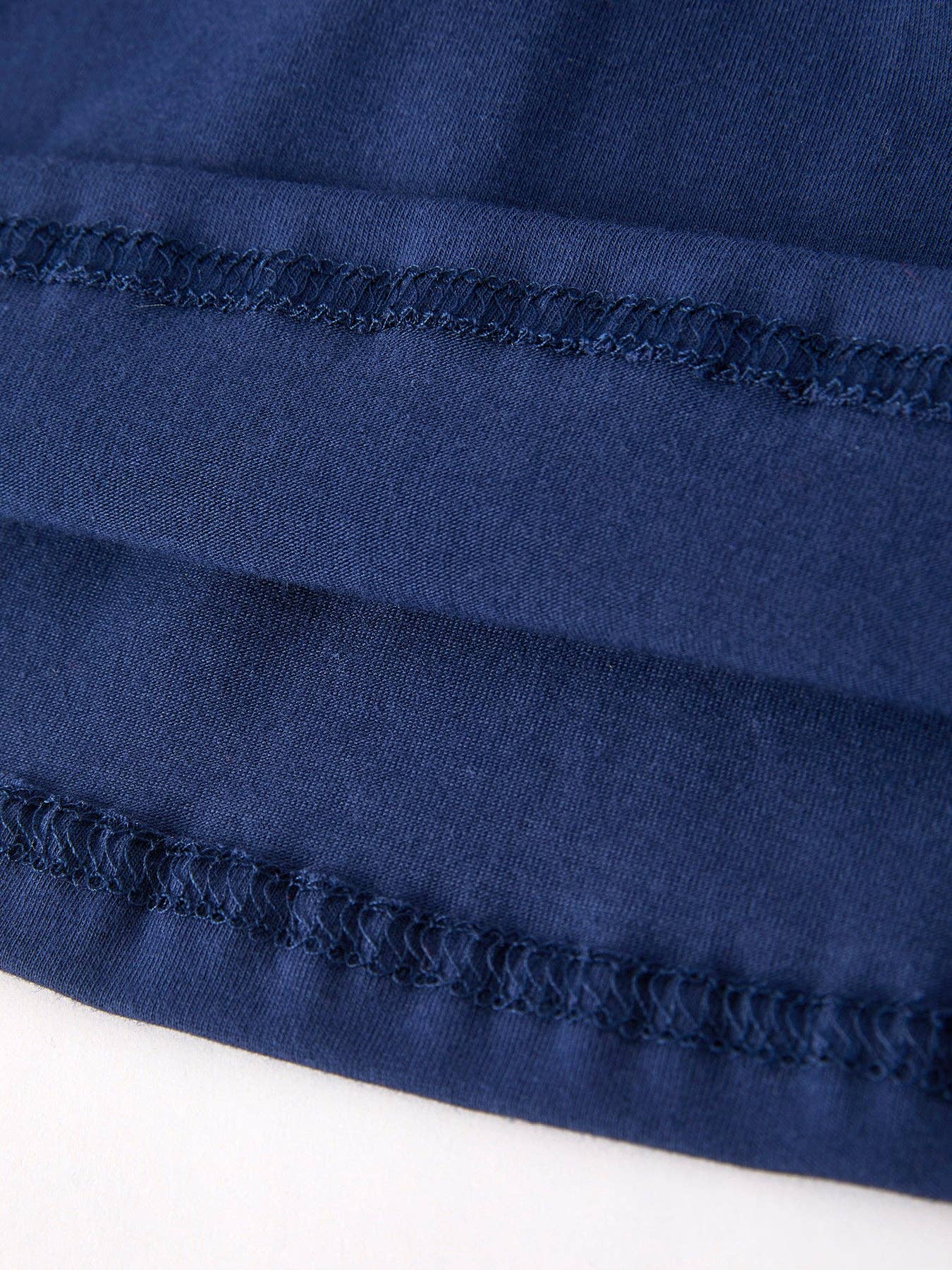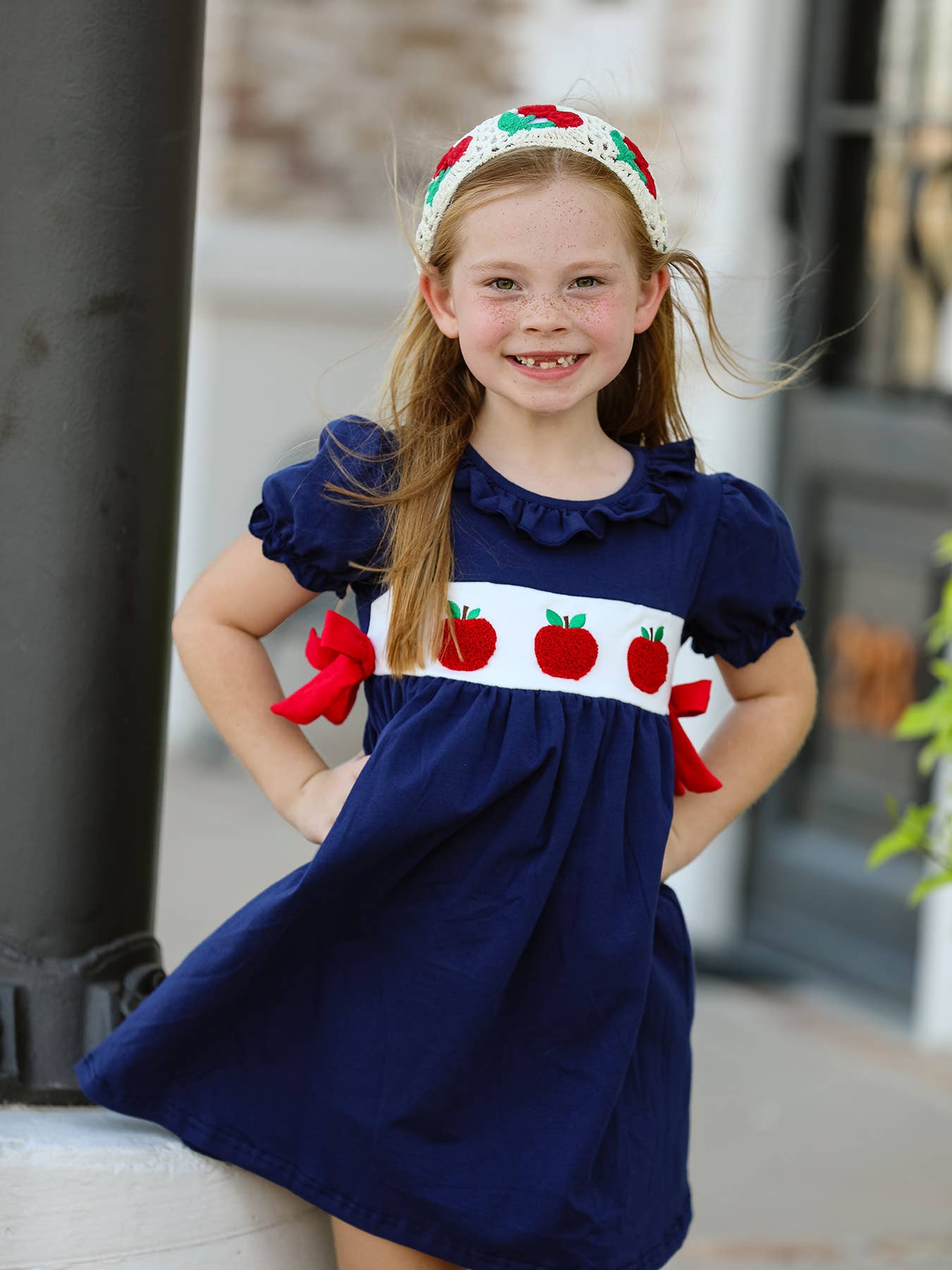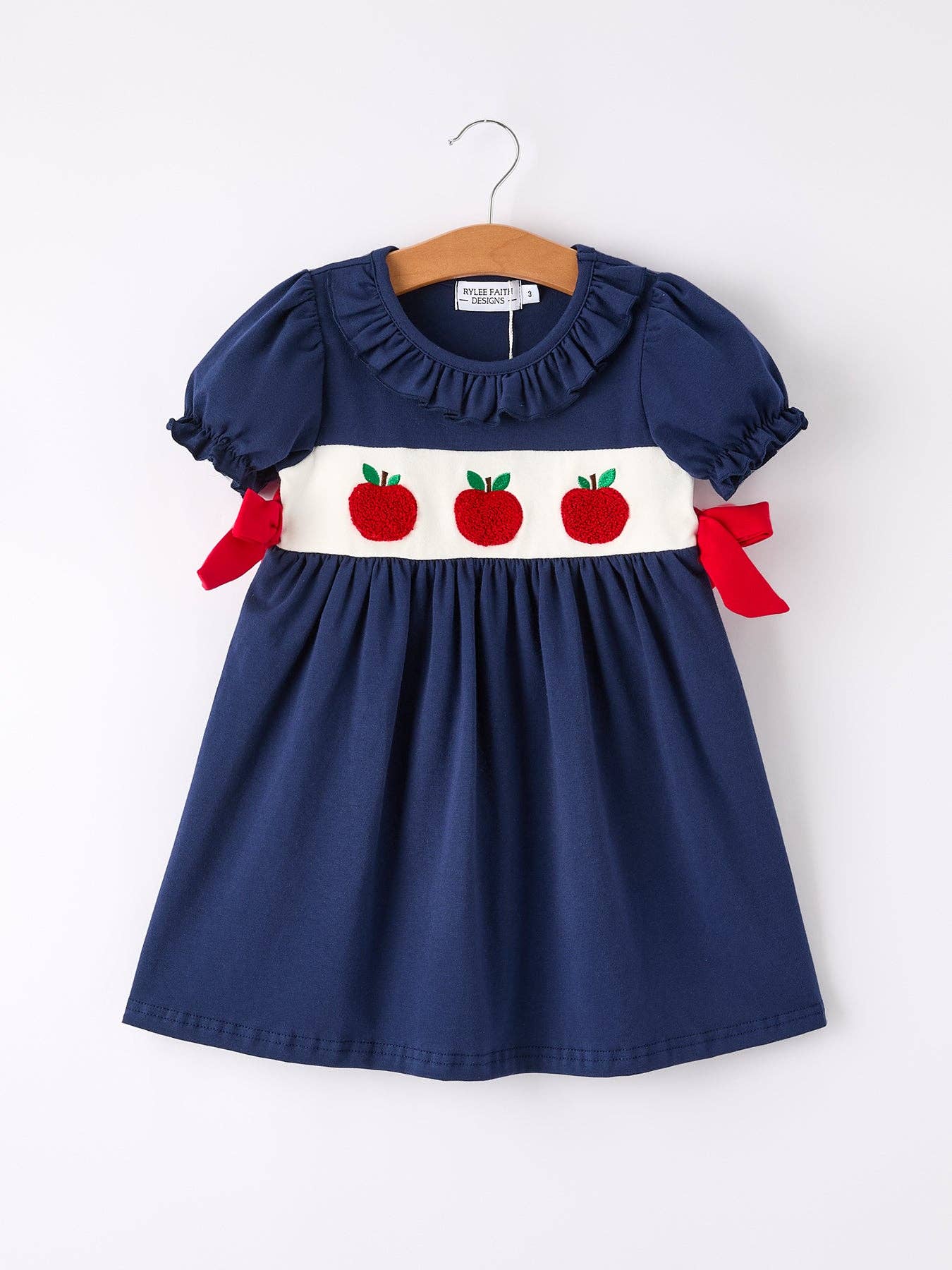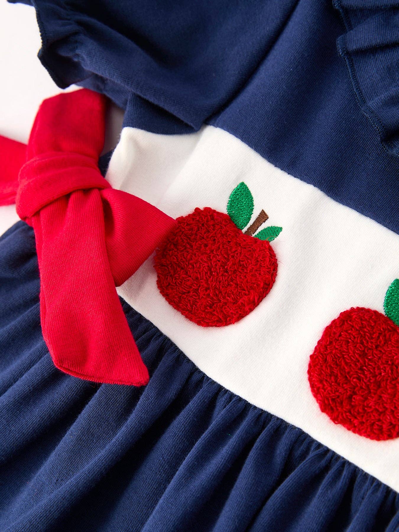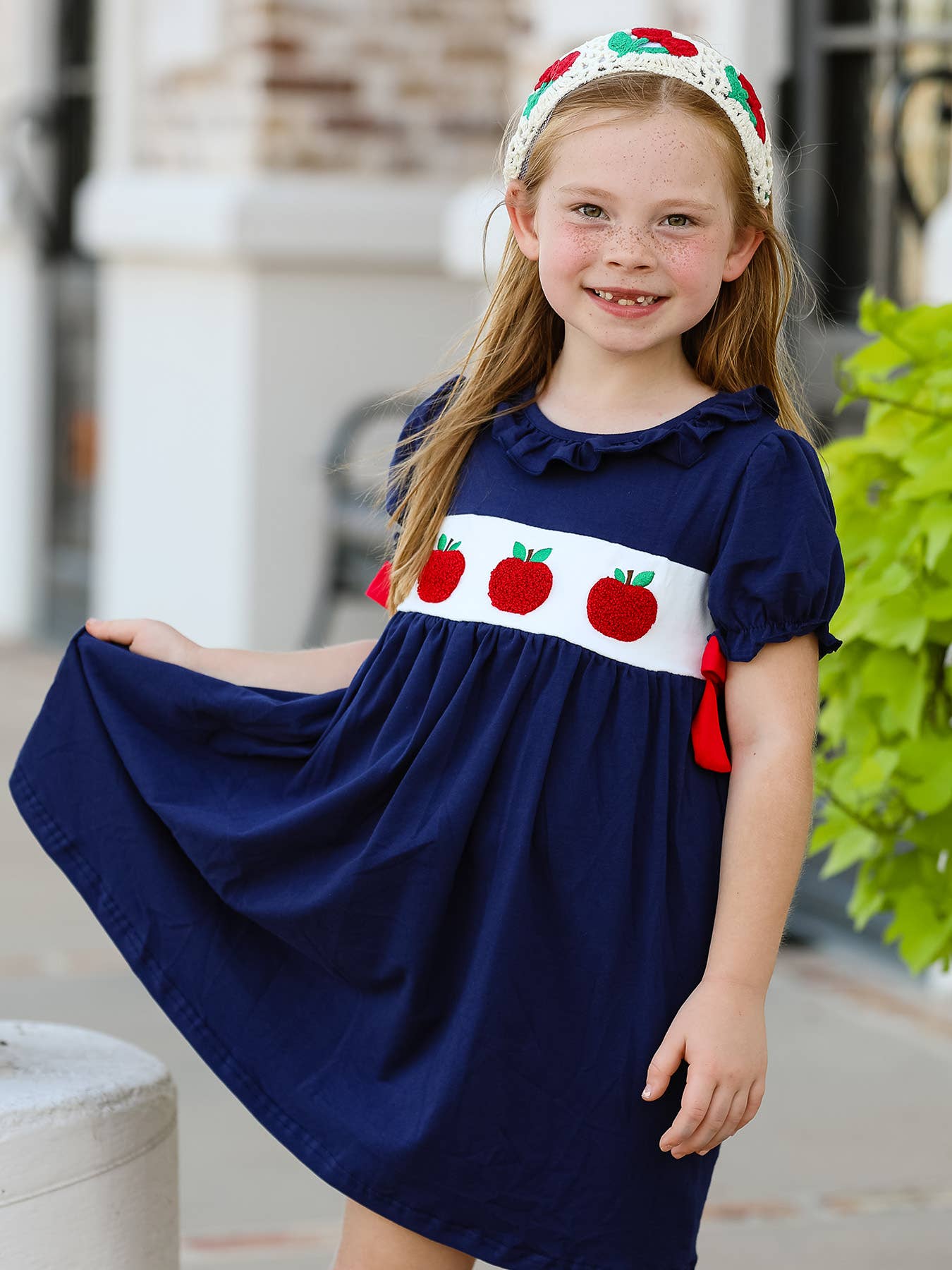 Embrace the back-to-school season with this charming navy dress adorned with a delicate bow apple applique. Perfect for your little girl's first day, it offers a classic look with a touch of whimsy. Get her ready to shine with this must-have dress!