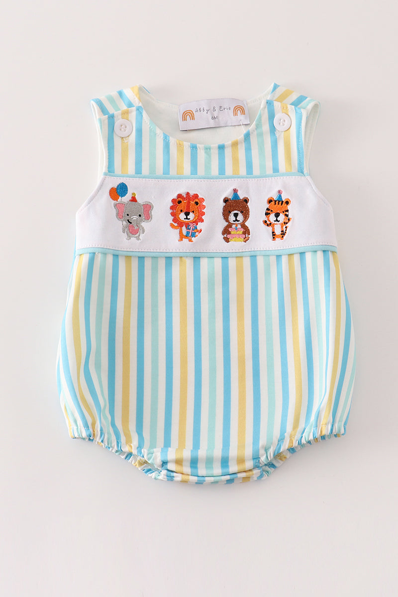 Get ready to party with this playful blue animal themed boy bubble. With embroidered birthday details and quirky animal accents, this bubble is sure to make a statement at any birthday celebration!